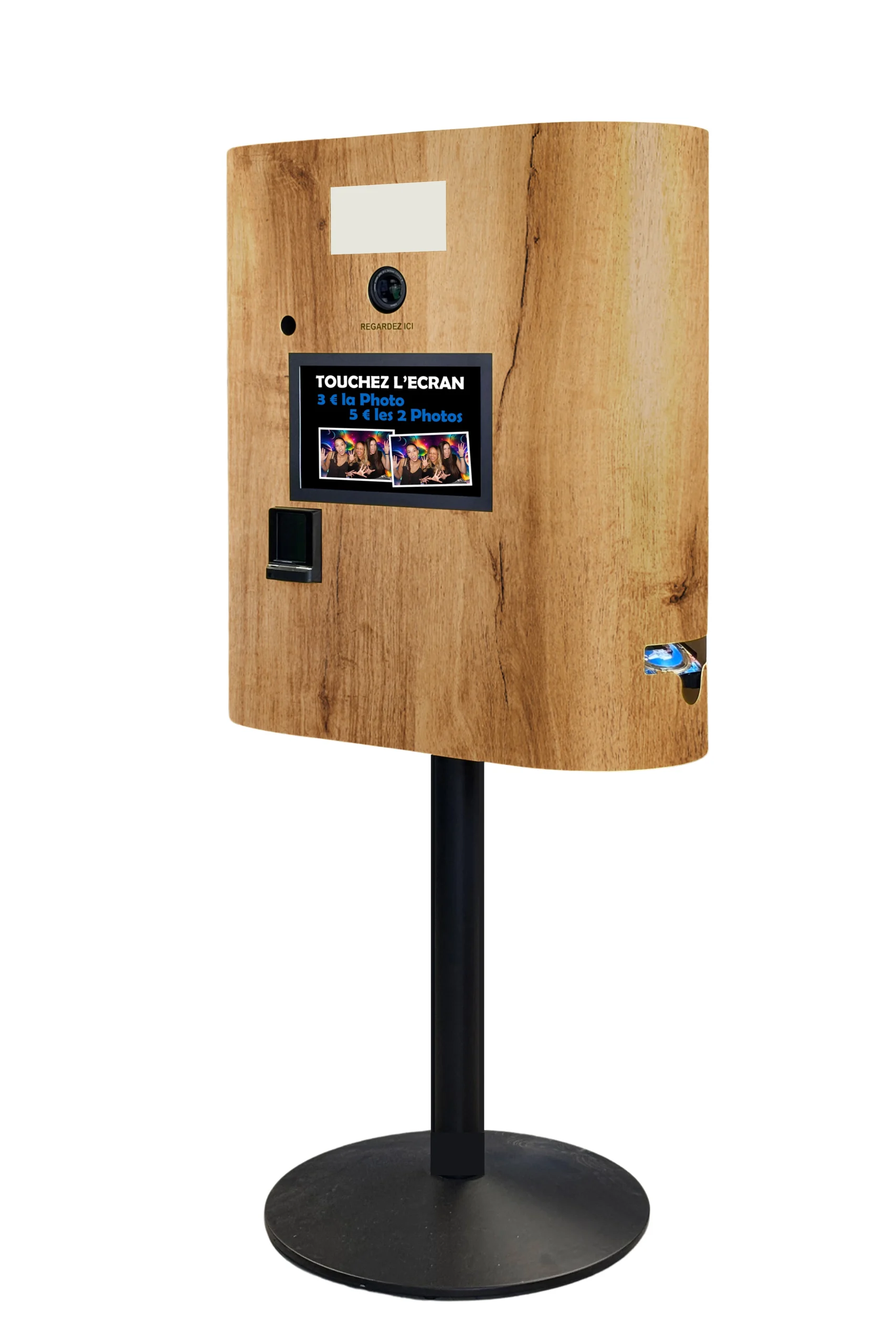 La borne Oblong Photobooth intègre tous les éléments pour une utilisation libre-service en poste fixe :